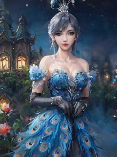 peacock, 1girl, solo, dress, gloves,feather dress, looking at viewer, hair ornament, elbow gloves, blue eyes, looking back, full body, standing, hair bun, bare shoulders, long dress, single hair bun, black gloves, flower, bangs, grey hair, closed mouth ,1girl,PRG1