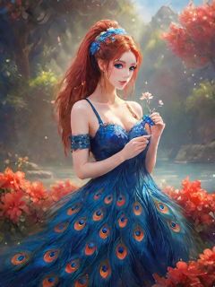 Peacock, a beautiful girl, solo, clothes, gloves, feather clothes, looking at the audience, hair accessories, elbow gloves, blue eyes, in retrospect, the whole body, standing, hair bun, bare shoulders, long dress, holding, black gloves, flowers, bang, red hair