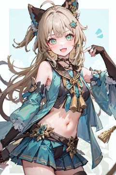 masterpiece, best quality, 1girl, official, green eyes,ahoge, hair ornament, bare shoulders, navel, detached sleeves, elbow gloves, fingerless gloves, tail, skirt,happy, open mouth, fang, upper body,