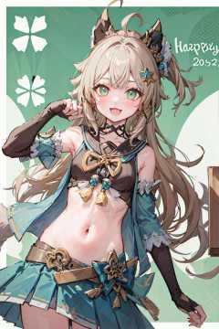 masterpiece, best quality, <lora:Genshin_Kirara_AP_v2:0.7>,1girl, official, green eyes,ahoge, hair ornament, bare shoulders, navel, detached sleeves, elbow gloves, fingerless gloves, tail, skirt,happy, open mouth, fang, upper body,