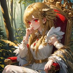 anime,Medium view, girl focus, a girl, sitting sideways on a luxurious chair, hand supporting chin, looking out of the camera, red eyes, detailed engraved picture part, delicate and beautiful face, exotic, mysterious forest, high detail red eyes, wind, wind blowing hair, windward, high detail hair, aristocratic clothing, fluff, golden feathers, epic, masterpiece, wooden, old, golden hair,1girl