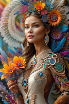 (masterpiece, top quality, best quality, official art, beautiful and aesthetic:1.2), (1girl), extremely detailed,(fractal art:1.1), proper fingers, (colorful:1.1)(flowers:1.3),highest detailed,(zentangle:1.2), (dynamic pose), (abstract background:1.3), (many colors:1.4), ,(earrings), (feathers:1.5)