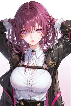 masterpiece, best quality, 1girl, <lora:StarRail_Kafka_AP_v1:0.75:LESS>, official, purple eyes, (empty eyes:1.2), eyewear on head, earring,shirt, black jacket, jacket on shoulders, large breasts,arms at sides, upper body, looking at viewer, simple background, pink background, purple background,