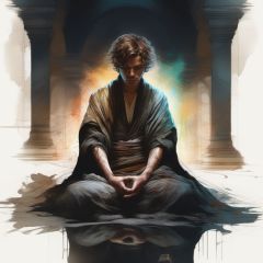seated meditation, Jedi, Caravaggio, shadows, space opera, futuristic, stone floor