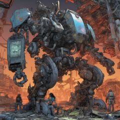 SIMON BISLEY STYLE, geof darrow style, horror, D.Va GIRL SITTING ON ROBOT, destroying humans, yoji shinkawa style, wasteland, hyper detailed, neon ambiance, abstract black oil, gear mecha, detailed acrylic, grunge, intricate complexity, rendered in unreal engine, isometric, digital art, smog, pollution, toxic waste, chimneys and railroads, 3 d render, octane render, volumetrics, by greg rutkowski