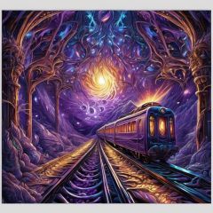 "imagine a bioluminescent purple glowing a train in ethereal enchanted wonderland, soft lighting, sharp focus,  paint drops, rough edges, trending on artstation, studio photo, intricate details, highly detailed"