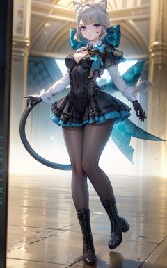 lnt, 1girl, purple eyes, cat ears, long hair,(star facial mark:1.1),grey hair, bangs, tail,black footwear, bow, long sleeves, dress, white gloves, boots,black pantyhose,lnt,littlefat
