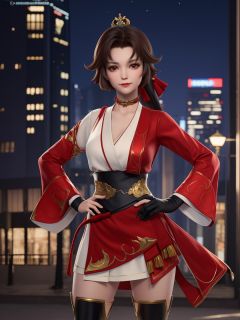 WZRYyunyingYP, 1girl, solo, thigh boots, hair ornament, looking at viewer, red eyes,single glove,sash,red dress,obi,choker,<lora:WZRYyunyingYP:0.75>,cowboy shot, cityscape, night, mature female, hand on hip,