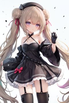 1girl, dress, double bun, hair bun, long hair, black dress, twintails, looking at viewer, smile, hat, bangs, brown hair, white background, solo, open mouth, blush, black headwear, very long hair, garter straps, thighhighs, bare shoulders, beret, :d, ribbon, black gloves, simple background, long sleeves, nail polish, black footwear, red ribbon, bow, gloves, wide sleeves, animal, hair ribbon, boots, red nails, sheath, sheathed, hair between eyes