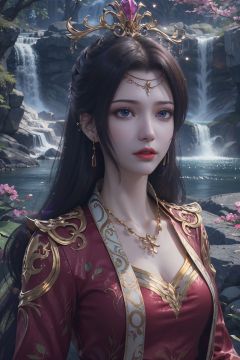masterpiece,best quality,official art,extremely detailed CG unity 8k wallpaper,1girl, upper body, purple hair, light rays, light particles, waterfall, tree, clover,  <lora:云韵:0.55>