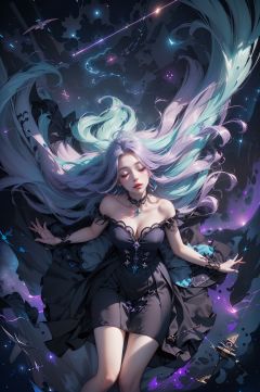 (Dreamweaver diva, phantasmal, surreal, night-sky hair, dreamscape, orchestrating, symphony of slumber, dress of dusk, floating among dreams, deep night, lullaby of the subconscious, dream orchestration scene,Neck,Unity, (from above):1.3)