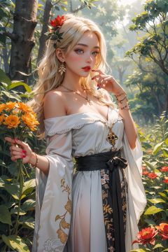 (absurdres, highres, ultra detailed)1girl, jewelry, flower, earrings, long hair, dress, blonde hair, solo, tree, skull, hair ornament, white hair, holding, ring, bracelet, nature, bare shoulders, leaf, watermark, lips, necklace, gem, parted lips, outdoors, red lips, off shoulder, day, web address, wide sleeves, forest, orange flower, nail polish, sunlight, standing, red flower, branch, blue eyes