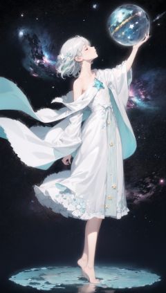 (((green, silver, glimmer)), limited palette, contrast, phenomenal aesthetic, best quality, sumptuous artwork,(masterpiece), (best quality), (ultra-detailed),(((illustration))), ((an extremely delicate and beautiful)),(detailed light),1girl,cold theme, broken glass, broken wall,((an array of stars)),((starry sky)),the Milky Way,star,Reflecting the starry water surface,(1girl:1.3)aqua theme,white hair,blinking,white dress,closed mouth,constel lation,flat color,noline art,full Glass sphere,girl inside glass sphere,white hair,braid,blinking,white robe,bust \(sculpture\),barefoot,float,closed mouth,constel lation,flat color,holding,holding wand,looking up,standing,male focus,medium hair,standing,solo,space,universe,utaite(singer),Nebula,many stars,
