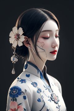 <lora:ciqiniren:0.85>,1girl,closed eyes,cyborg,flower,jewelry,simple background,skin made of porcelain,solo,yanshangyue_ciqiniren,