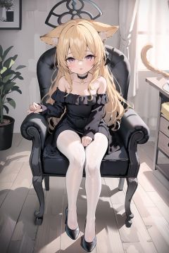 masterpiece, ((best quality)),  dynamic angle, chromatic aberration, ((colorful)),1girl, animal ears, dress, tail, solo, long hair, pantyhose, purple eyes, cat ears, cat, cat girl, cat tail, black dress, white pantyhose, standing, indoors, black footwear, animal ear fluff, looking at viewer, flower, off shoulder, full body, frilled dress, brown hair, long sleeves, blush, bangs, plant, choker, bare shoulders, potted plant, wooden floor, black choker, frills, boots, parted lips, very long hair, animal, blonde hair, chair, bow, collarbone, puffy sleeves, hair between eyes, shoes, black collar