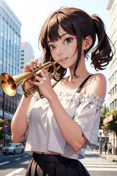 1girl, playing trumpet, trumpet, masterpiece, best quality, 8k,  white off-shoulder top, on the street,  <lora:trumpet_v1:0.67>