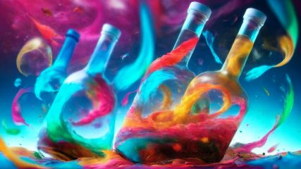 (Abstract atmosphere background: 1.5) (imid shot: 0.95),(total: 1.25), dynamic Angle, [bottom of bottle], closed up,(wrong color: 1.3), colorful, floating colorful wind,(highest image quality),(main work),