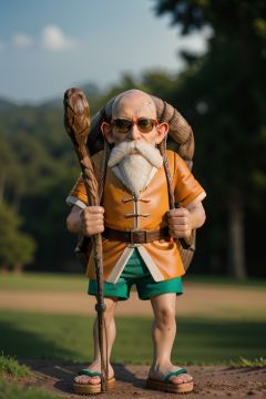 cinematic photo cinematic film still k4k3k, facial hair, sunglasses, beard, bald, old, old man, white hair, ((dwarf)),mustache, staff, shirt, shorts, holding, standing, orange chinese clothes, pants, bag, sandals, holding staff ,<lora:k4k3k-03:1> . shallow depth of field, vignette, highly detailed, high budget Hollywood movie, bokeh, cinemascope, moody, epic, gorgeous, film grain, grainy . 35mm photograph, film, bokeh, professional, 4k, highly detailed