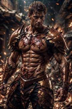 4rmorbre4k, torn clothes, broken armor, debris, injury, pained expression, embarrassed, blush, pectorals, abs, ((fighting stance)), dynamic pose, medieval fantasy background, close up, face portrait, fl3sh4rmor, wearing embers knight armor, blood, meat, veins, (from side:0.7), best quality, masterpiece, realistic, (detailed background), depth of field, intricate details, 8k, art by greg rutkowski, detailed skin texture, detailed face, realistic eyes, male focus, photo of a man,