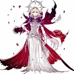 (best quality), ((masterpiece)), (highers), original, extremely detailed CG unity 8k wallpaper,white background,monochrome, 1girl, solo, medium hair, blonde hair, gloves, hairband, dress, red eyes, very long hair, white gloves, petals, hand on hip, looking at viewer, frills, layered dress, cape, cloak, torn clothes, standing, hood, lips <lora:Final_Fantasy_Logo_style:1>