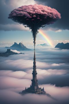 a surreal view of clouds, by Tom Froud, surreal art contest winner, dreamlike, pink clouds, rainbow skies, fluffy, abstract clouds, fantasy, dreamworld, surreal landscapes, cloud castles, floating gardens, impossible structures, secret gardens, a journey through a dream, enchanted skies, mysterious beauty, mythical