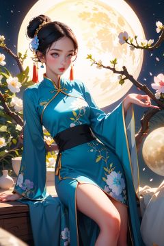 1girl, flower, hair ornament, solo, long hair, black hair, holding, holding flower, branch, jewelry, chinese clothes, hair bun, earrings, hair flower, long sleeves, petals, moon, wide sleeves, forehead mark, blue flower, dress