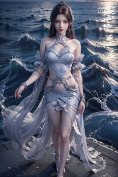 masterpiece,best quality,official art,extremely detailed CG unity 8k wallpaper,realistic,1girl,seductive smile,full body,standing,light rays,light particles,ocean,seagull,watercraft,<lora:月婵:0.55>,