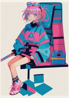 1girl, <lora:clearstyle:0.8>,clearstyle,blue background, sitting, pink hair, shop, simple background,