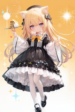 (cinematic lighting),  dreamy atmosphere,  Ray tracing,  (((solo))),  (loli:1.5),  (child:1.5),  (petite:1.5),  green eyes,  (animal ears),  dress,  solo,  food,  blonde hair,  open mouth,  long hair,  pancake,  flower,  holding,  bow,  smile,  fork,  bird,  socks,  looking at viewer,  shoes,  striped background,  holding fork,  bonnet,  striped,  frills,  long sleeves,  :d,  yellow dress,  bangs,  eyebrows visible through hair,  blush,  green nails,  hair bow,  nail polish,  diagonal stripes,  chick,  sparkle,  frilled dress,  orange bow,  fruit,  full body,  :3,  hair between eyes,  green bow,  puffy sleeves,  heart,  lemon,  orange footwear,  animal ear fluff,  white bow,  cat ears,  bobby socks,  orange headwear,  see-through sleeves,  blue background,  striped bow,  hair ornament,  white legwear,  mary janes