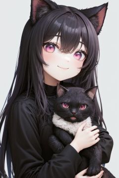 1girl, solo, outdoors, portrait,  (upper body,hold a cat, cat girl,simple background), pink eyes, colorized, smile