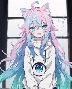 NLP,anime,2d,cowboy shot, masterpiece,Splash color, soft lighting,(cocktail glass), 1girl, solo, cat ears, multicolored hair, ((gradient hair), white+(blue)+(pink:0.5) hair//), very long hair, messy hair, bangs, ahoge, ((gradient eyes), pink+light_blue eyes//), slit pupils, glowing eyes, 1fang, white sweater,