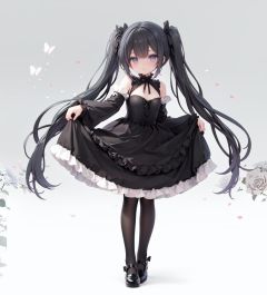 masterpiece, ((best quality)),  dynamic angle, chromatic aberration, ((colorful)),1girl, solo, black hair, long hair, dress, butterfly, bug, twintails, black footwear, lolita fashion, very long hair, pantyhose, black dress, long sleeves, bow, full body, bangs, flower, puffy sleeves, standing on one leg, shoes, white pantyhose, hair bow, looking at viewer, grey eyes, frills, standing, gothic lolita, blush, juliet sleeves, black bow, frilled dress, white flower, rose, closed mouth, skirt hold, petals, wide sleeves, mary janes, white rose