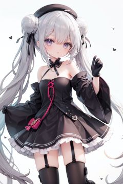 1girl, dress, double bun, hair bun, long hair, black dress, twintails, looking at viewer, smile, hat, bangs, brown hair, white background, solo, open mouth, blush, black headwear, very long hair, garter straps, thighhighs, bare shoulders, beret, :d, ribbon, black gloves, simple background, long sleeves, nail polish, black footwear, red ribbon, bow, gloves, wide sleeves, animal, hair ribbon, boots, red nails, sheath, sheathed, hair between eyes