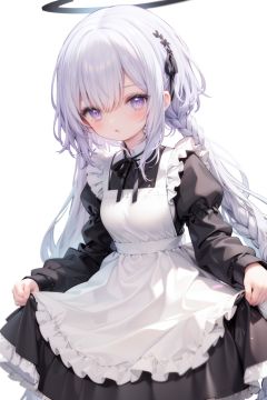 1girl, solo, apron, long hair, hair over one eye, white background, frills, braid, halo, long sleeves, dress, simple background, white hair, white apron, puffy sleeves, very long hair, frilled apron, maid, purple eyes, ribbon, parted lips, maid apron, bangs, juliet sleeves, black dress, neck ribbon, looking at viewer, single braid, blush