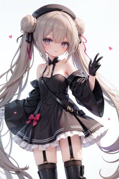 1girl, dress, double bun, hair bun, long hair, black dress, twintails, looking at viewer, smile, hat, bangs, brown hair, white background, solo, open mouth, blush, black headwear, very long hair, garter straps, thighhighs, bare shoulders, beret, :d, ribbon, black gloves, simple background, long sleeves, nail polish, black footwear, red ribbon, bow, gloves, wide sleeves, animal, hair ribbon, boots, red nails, sheath, sheathed, hair between eyes