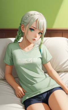 realistic 3d film CG, high detail 2D game poster, 1girl, white_hairbangs, long hair, side braid, dark blue eyes, cold expression, lightseagreen T-shirt, navel, fetal_position , Light green shorts, small_breasts, No shoes on, bedroom, White cloth sofa, White blanket, White curtains, bare feet, bare legs, detail eyes,