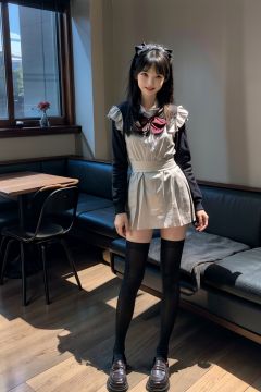 (masterpiece),(best quality), (ultra-detailed),HDR,UHD,8K,realistic,reality_ray_tracing,sunlight,RAW photo, top-notch quality, masterpiece, HDR:1.2, exceptionally detailed RAW color photo, professional-grade photograph, (realistic, photorealistic:1.37), (highly detailed skin:1.2), ultra-high resolution,exquisitely detailed eyes,1girl,long hair,black hair,light smile,maid custume,black thighhighs,loafers,standing,cafe,sun,looking_at_viewer,<lora:gxwh:0.5>, <lora:add_detail:0.8>, <lora:jyy:0.7>