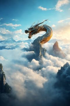 A dragon flying through the clouds in the sky, with a mountain in the background and a mountain top in the foreground, vast panorama, Unreal light and shadow, wide Angle lens, shot at dusk, movie texture, Unreal Engine 4,8K Ultra HD, clear and bright image quality, Amazing fantasy immortal scenes, ink painting style, highly refined, dynamic expression, clear lines, movie texture, Cold atmosphere, vivid, rendering high poignancy, extremely fine