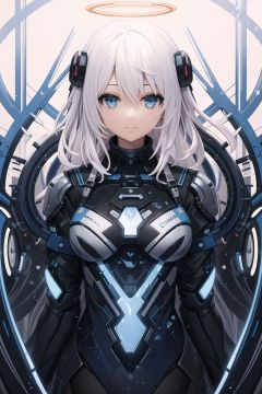 (abstract art:1.4), masterpiece, best quality, ultra high res, beautiful, visually stunning, (1girl:1.2), blue light, blue theme, mechanical, Smile halo, side view, looking at viewer