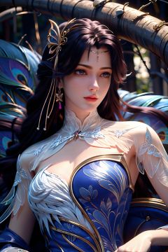 Best Quality, masterpiece, ultra-high resolution, (photo realistic: 1.4) , Surrealism, Fantastical verisimilitude, beautiful blue-skinned goddess Phoenix Peacock on her head, fantastical creation, thriller color scheme, surrealism, abstract, psychedelic, 1 girl,flower,castle,jyy-hd,1 girl,mds-hd,xwhd,yx-hd