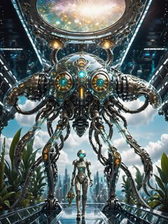 (young glass sentient organic alien robot octopus) walking on glass spaceship bridge, clear glass future fantasy concept, a glass city, epic scale, future, detailed sentient organic linked together inside glass to form body, year 3000, sci fi, glass space ships floating by, amazing fine close overwhelmingly detailed, galaxy over plants atmosphere, detailed robot face, clear depth of field, vignette, highly detailed, high budget, bokeh, cinemascope, epic, gorgeous, film grain, grainy . magnificent, celestial, ethereal, painterly, epic, majestic, magical, fantasy art, cover art, crouds of people walking, (((distant view from low orbit))), pictograph, dust_particles,DonMCyb3rN3cr0XL ,Clear Glass Skin with metal flowers inside