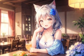animal ears, 1girl, blurry background, hair ornament, flower, looking at viewer, open mouth, hair flower, smile, blurry, braid, fang, solo, drinking straw, animal ear fluff, blush, dress, long hair, sitting, :d, bare shoulders, table, depth of field, twin braids, cup, bangs, cat ears, orange slice, off shoulder, food, drinking glass, elbows on table, chair, fruit, drink, grey eyes, off-shoulder dress, blue flower, upper body<lora:LAM V6:1>