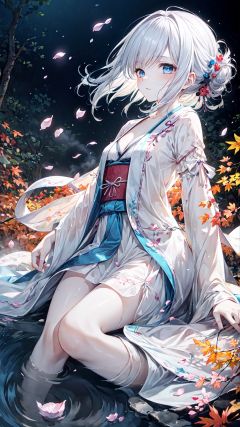 (((night))),in autumn,Japanese lantern,Japanese hairpin,wind,(flying petal:1.5),maple,((Falling Maple Leaves)),sprinkle,In the pond,Beautiful detailed water surface,Water Reflection,In the pond,detailed water,ripple,fog,sitting,