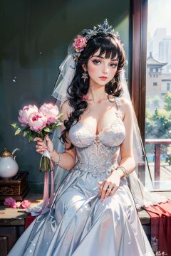 (wedding_dress:1.4),best quality,masterpiece,(landscape:1.3),(peony (flower):1.2),(photorealistic:1.4),unity 8k wallpaper,vase,sunlight,blunt bangs,huasanchuan,(ultra detailed:1.3),(light_on_face:1.4),1girl,blcc,solo,(looking at viewer:1.2),looking at viewer,(leaning_on_object:1.2),light rays,large breasts,(long hair:1.3),outdoors,chinese new year,