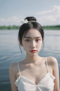 analog film photo A black-haired girl, wearing a white dress, with a single hair bun adorned with a hairpin, her eyes closed, standing alone on the water surface, reflecting her image. She is a fair-skinned female, revealing her collarbone and bare shoulders as she faces the viewer, against a light gray background in a minimalist style. . faded film, desaturated, 35mm photo, grainy, vignette, vintage, Kodachrome, Lomography, stained, highly detailed, found footage