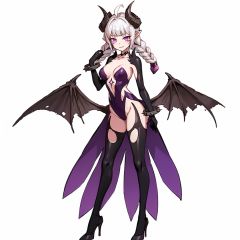 (best quality), ((masterpiece)), (highers), original, extremely detailed CG unity 8k wallpaper,Nyarly, pointy ears, demon girl, twin braids, high heels, purple eyes, black thighhighs, demon wings, demon horns, purple leotard1girl,full_body,smile,standing,simple background, white background,, <lora:Nyarly_DNF:0.7>
