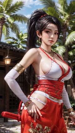 (masterpiece, best quality:1.3) DOAMomiji, 1girl, solo, long hair, breasts, looking at viewer, large breasts, holding, cleavage, bare shoulders, brown eyes, jewelry, ponytail, weapon, detached sleeves, japanese clothes, necklace, tree, lips, sash, high ponytail, rope, ninja, hip vent, DOAMOMIJI, <lora:EMS-14797-EMS:0.400000>, , <lora:EMS-14488-EMS:0.800000>, , <lora:EMS-26397-EMS:0.800000>, , <lora:EMS-57421-EMS:0.800000>
