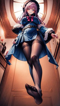 1girl, aajuvia, long hair, blue headwear, fur-trimmed headwear, capelet, blue dress, long sleeves, belt, side slit, tattoo, (black thighhighs), thick thighs, big breasts, wide hip, half closed eyes, smug, (smirk), happy expression, bar, medieval bar, standing, one leg up, (****:1.2), feet pantyhose, (foreshortening), (from below:1.3), looking at viewer, masterpiece, extremely detailed CG unity 8k wallpaper, best quality, 32k, focus sharp, , , FFA, From below, Leg up, <lora:EMS-14797-EMS:0.400000>, , <lora:EMS-57409-EMS:0.700000>, , <lora:EMS-32356-EMS:0.800000>