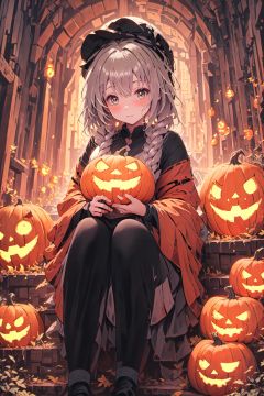 Curvaceous,1girl,sitting on 1spooky pumpkin,full body view,creepy pumpkins background,dressed as a witch,tall witch hat,thigh_highs,mini_skirt,large_hips,spooky,ghosts, Halloween, gigantic_breasts,cleavage cutout,blushing,ahegao_face,black-hair,green-eyes,heart-shaped_pupils,long_hair,tiny-waist,High detailed, JaLanteen, secai