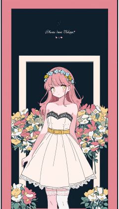 ((best quality)), ((masterpiece)), ((ultra-detailed)), (illustration), (detailed light), (an extremely delicate and beautiful),incredibly_absurdres,(glowing),(1girl:1.7),solo,a beautiful girl,(((cowboy shot))),standding,((Hosiery)),((beautiful lace-trimmed strapless dress+white stocking):1.25),((Belts)),(leg loops),((Hosiery)),((flower headdress)),((pink hair)),(((beautiful yellow eyes))),((english text)),(flower:1.65),(rose),(garden),(Botanical illustration),(((border:1.75))),